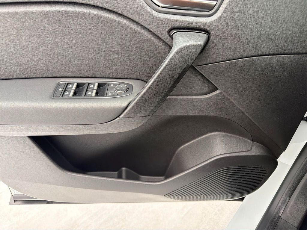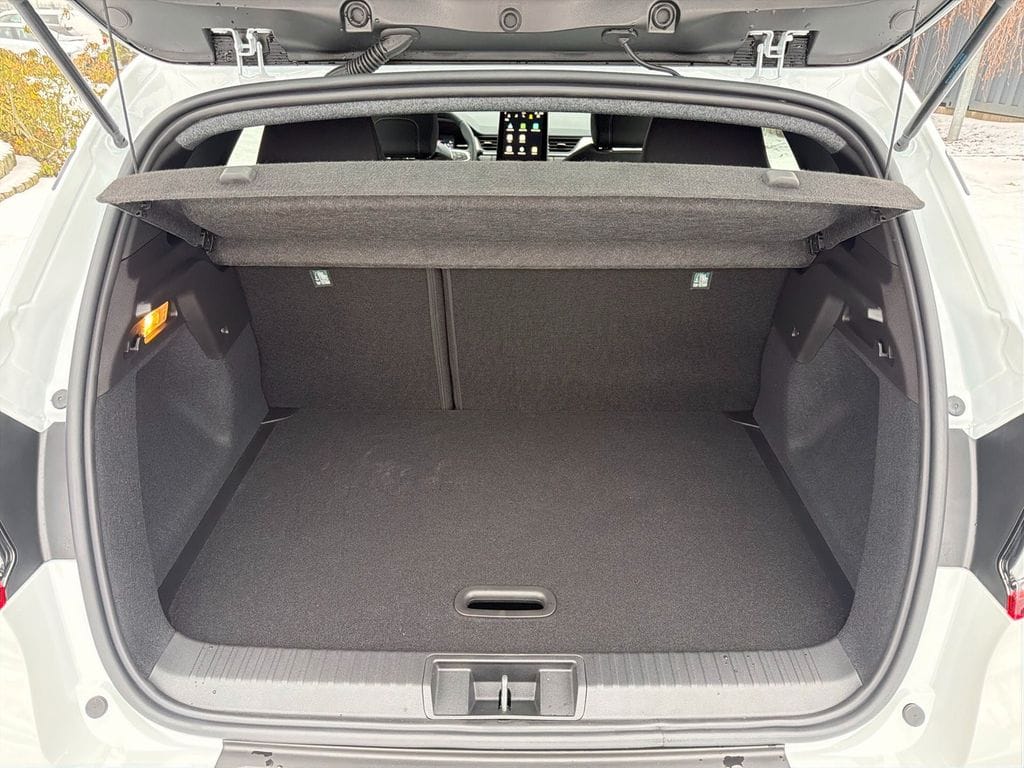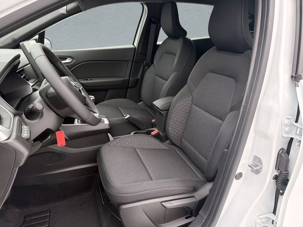 Die weiße Metallic-Lackierung verleiht dem Fahrzeug eine elegante Optik. Im Innenraum erwarten Sie schwarze Stoffsitze, ein Multifunktionslenkrad mit Leder und ein digitales Cockpit mit Touchscreen.